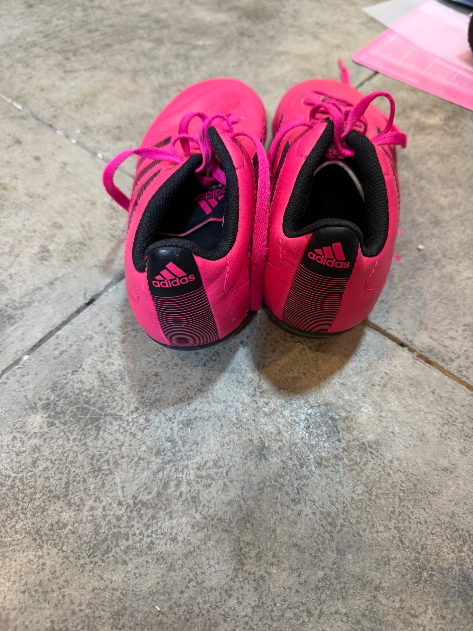 Stand out on the field with these bold hot pink Adidas soccer cleats featuring classic black three-stripe detailing.