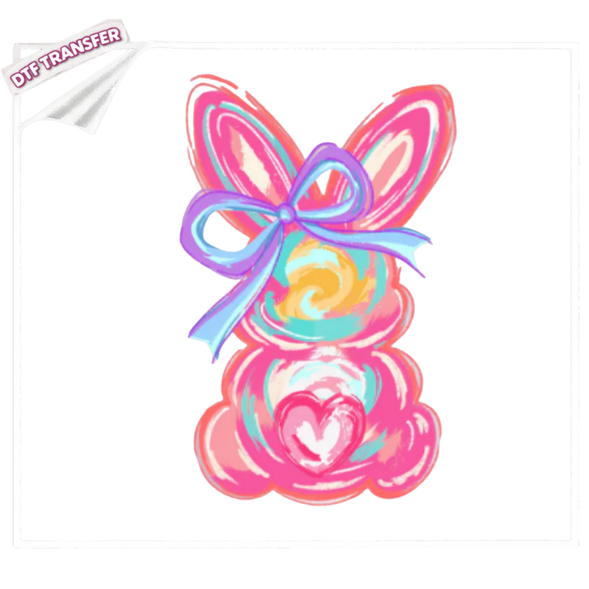 This colorful swirl bunny silhouette features vibrant pastel brush strokes and a statement bow, making it perfect for trendy Easter shirts, sweatshirts, and tote bags.