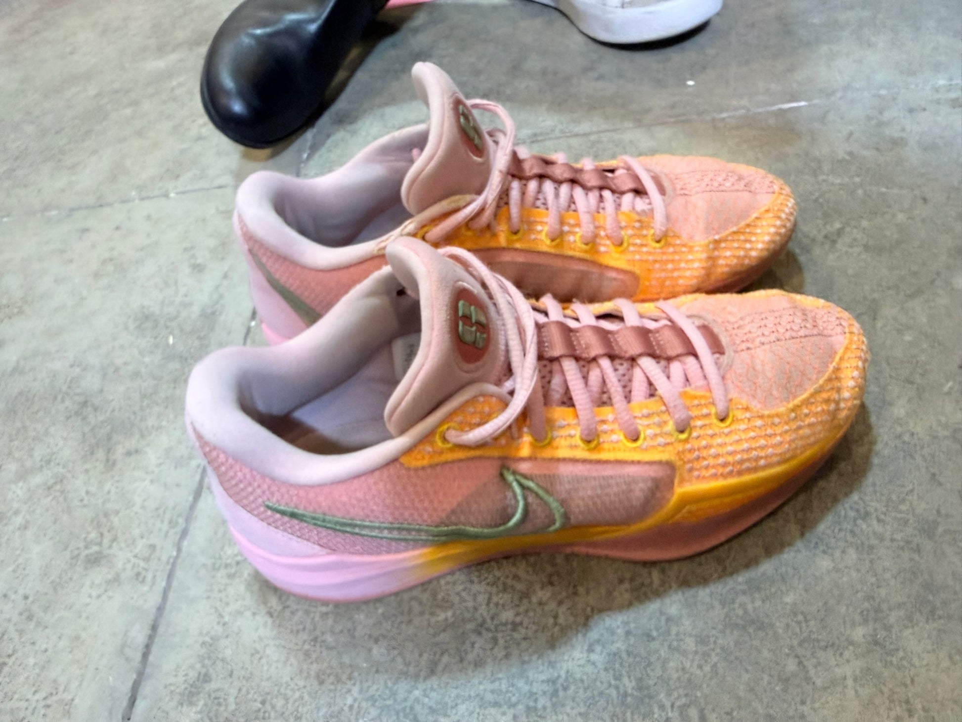 Vibrant Nike KD basketball shoes in pink and orange with textured mesh upper and green Swoosh detailing. Designed for indoor court performance and everyday athletic wear.